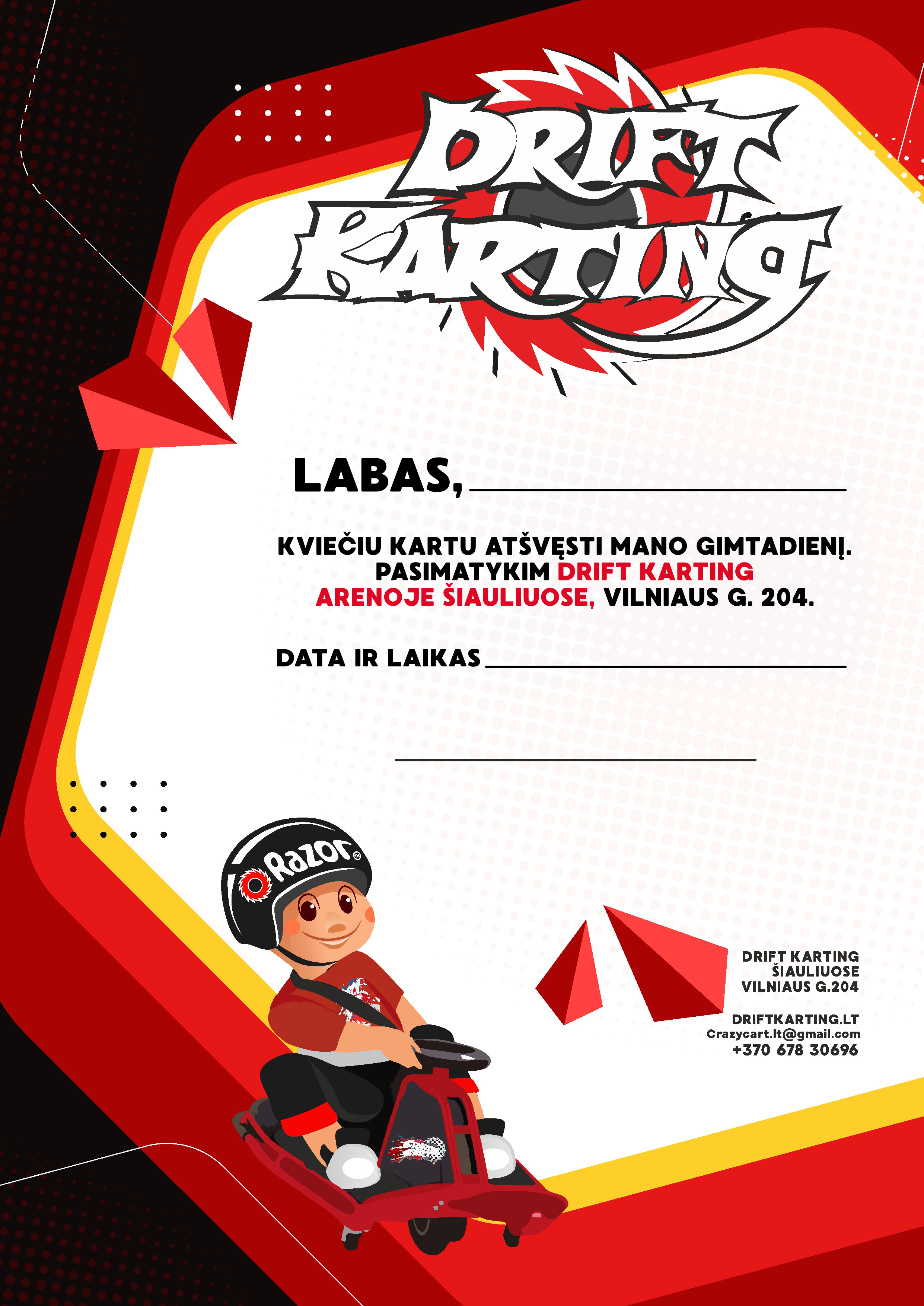 Šis drifto kartingas sukurtas specialiai vaikams ir paaugliams – dabar net penkiamečiai gali „driftuoti į šoną“! 🏎 Suteikiame viską, ko tam reikia: šaunias trasas, ryškius šalmus ir pozityvią nuotaiką. Su „Crazy Cart“ jūsų vaikas patirs nuostabiausius nuotykius, kuriuos prisimins daugelį metų!